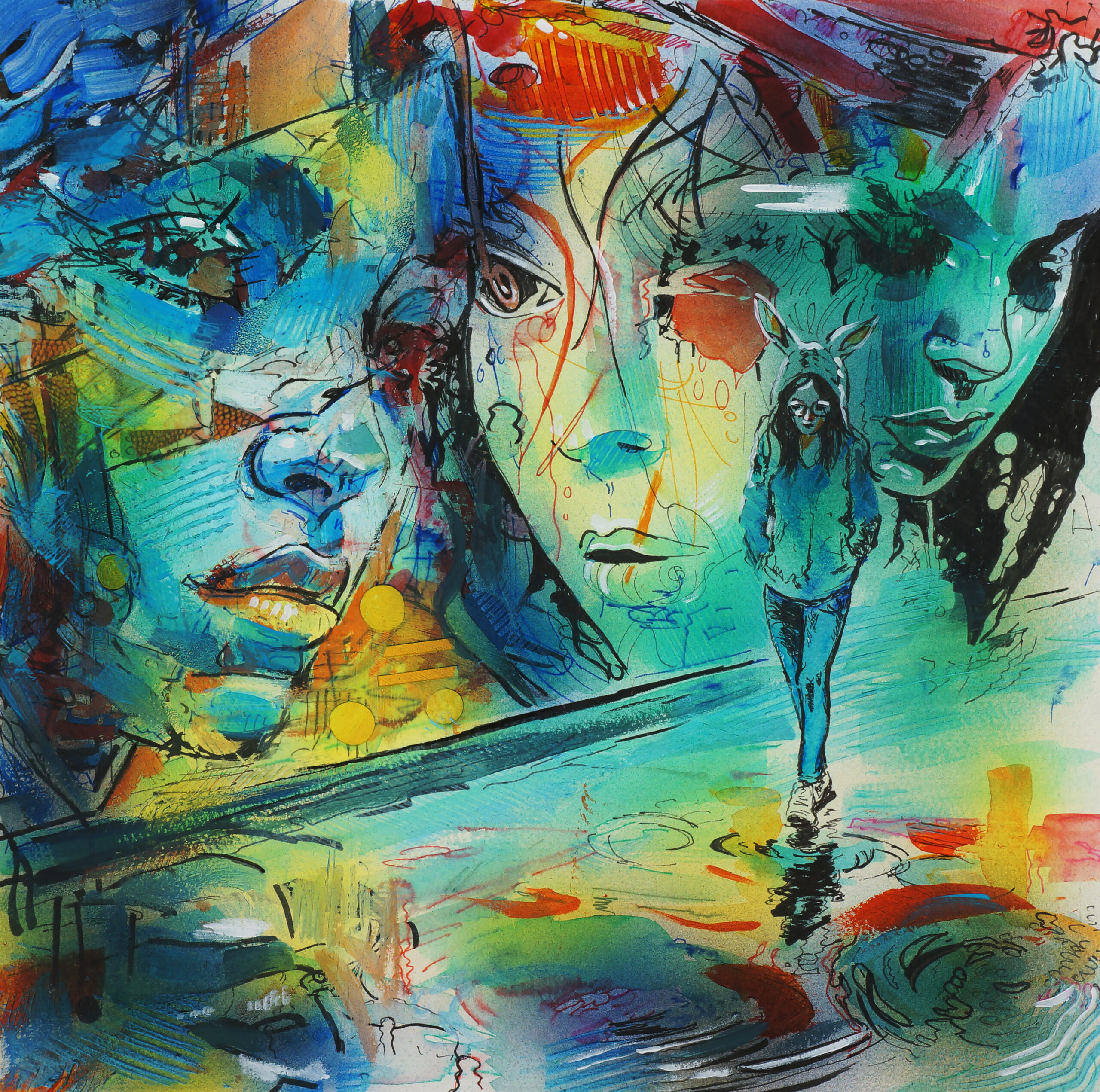 mixed media and paper on board